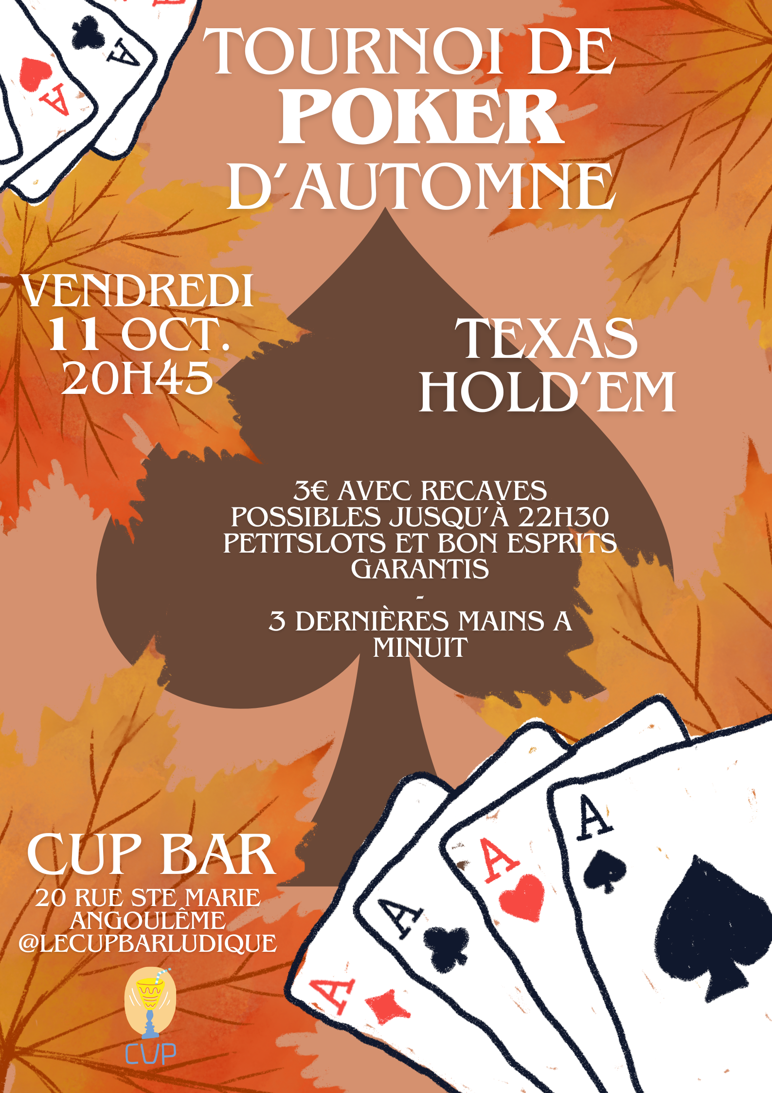 Place au bluff ! Venez avec votre meilleur poker face pour notre tournoi de Texas Hold’Em.